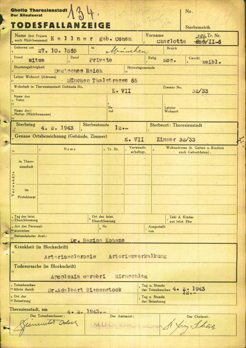 Kellner Charlotte: Todesfallanzeige, Ghetto Theresienstadt
