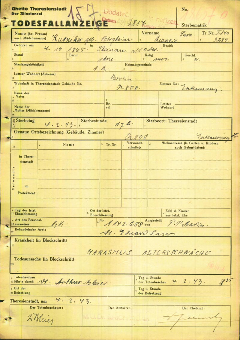 Kurnicker Rosalie: Todesfallanzeige, Ghetto Theresienstadt