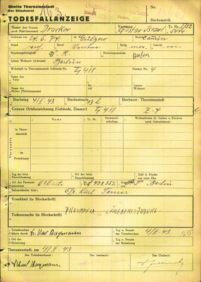Drucker Gustav: Todesfallanzeige, Ghetto Theresienstadt