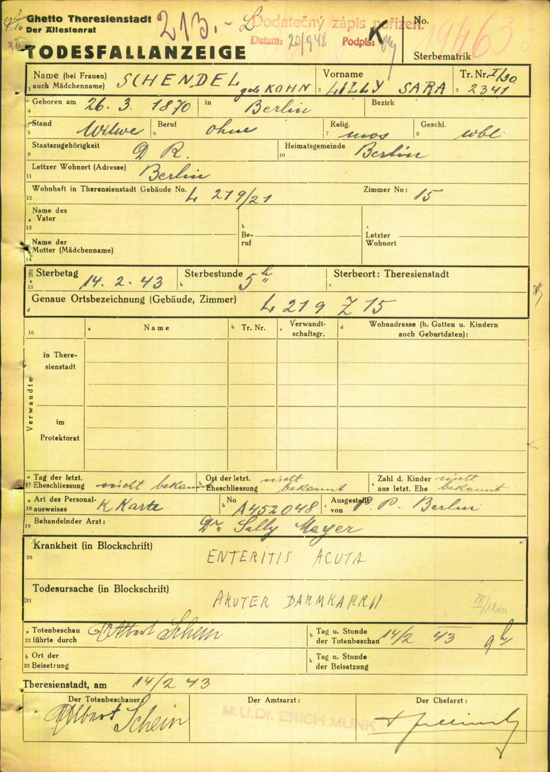 Schendel Lilli: Todesfallanzeige, Ghetto Theresienstadt