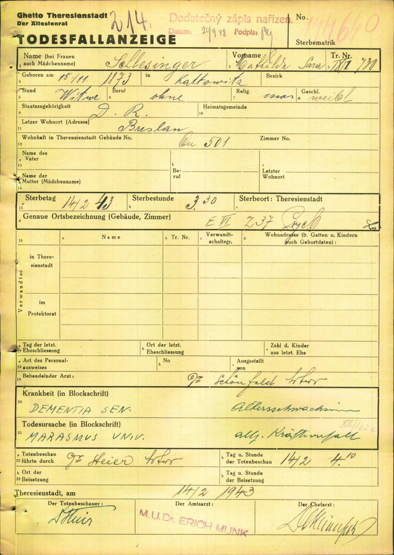 Schlesinger Mathilde: Todesfallanzeige, Ghetto Theresienstadt