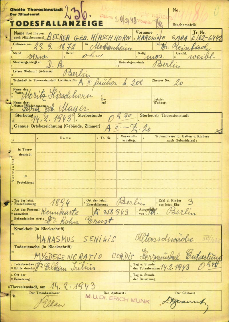 Becker Karoline: Todesfallanzeige, Ghetto Theresienstadt