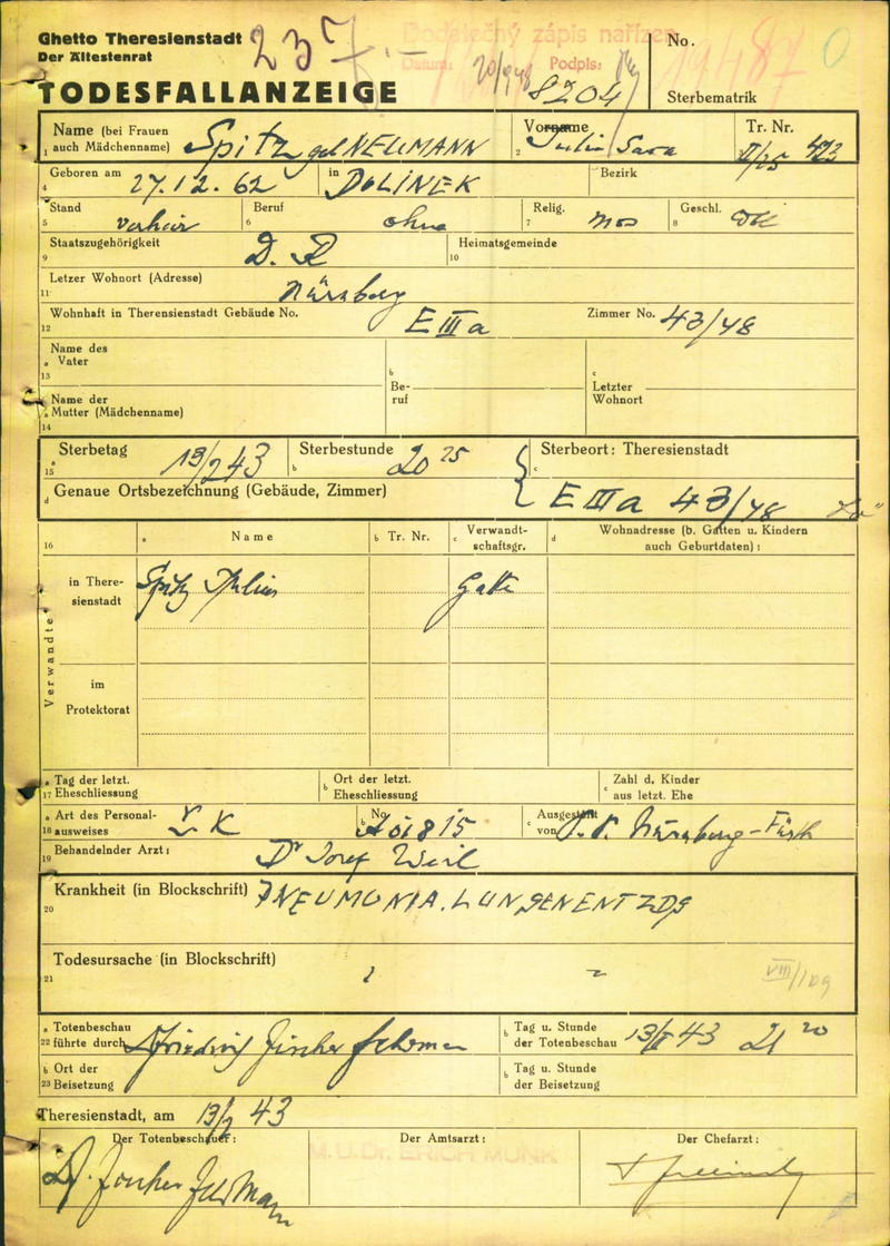 Spitz Julie: Todesfallanzeige, Ghetto Theresienstadt