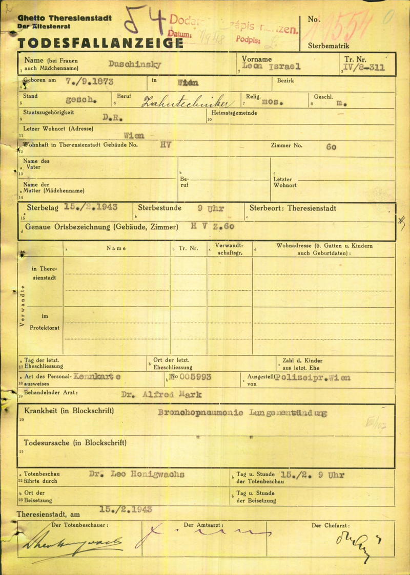 Duschinsky Leon: Todesfallanzeige, Ghetto Theresienstadt