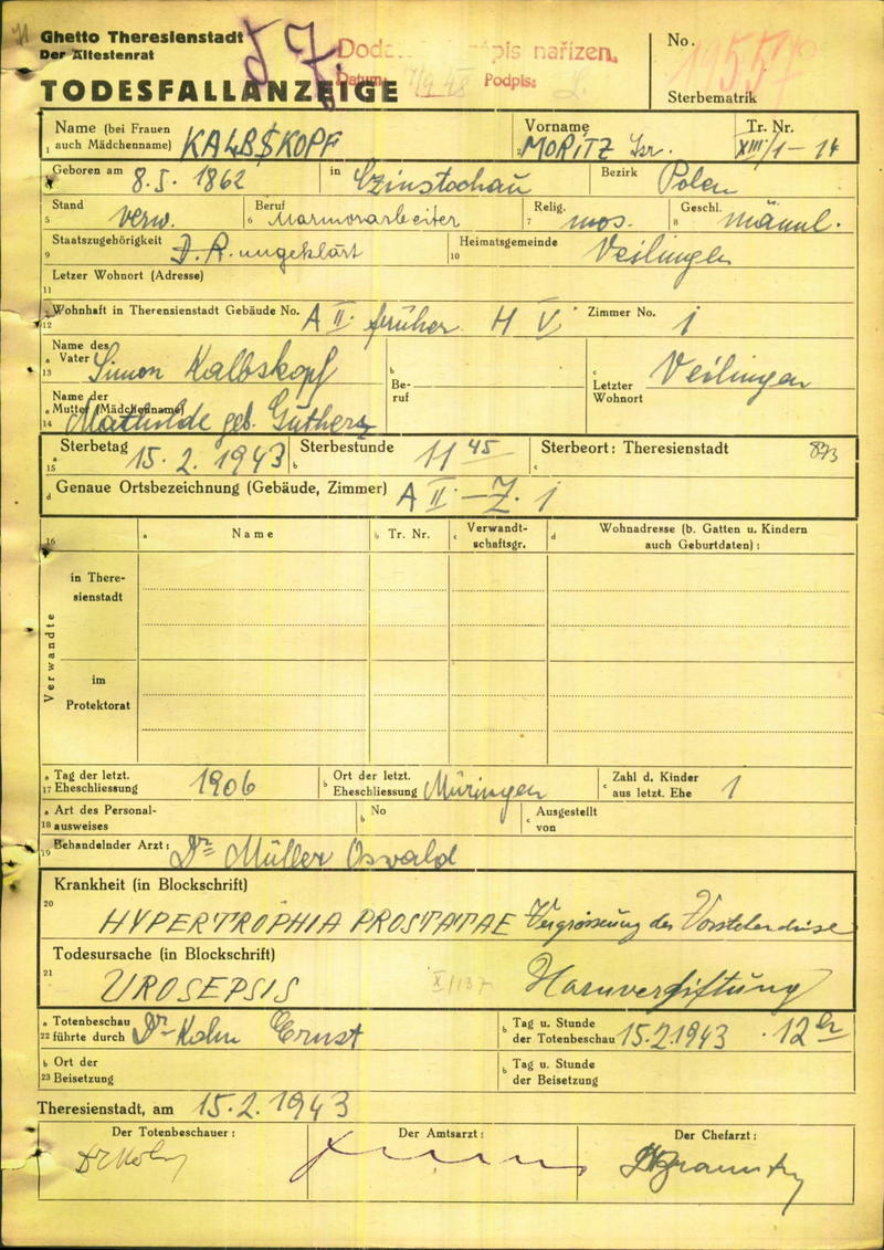 Kalbkopf Moritz: Todesfallanzeige, Ghetto Theresienstadt