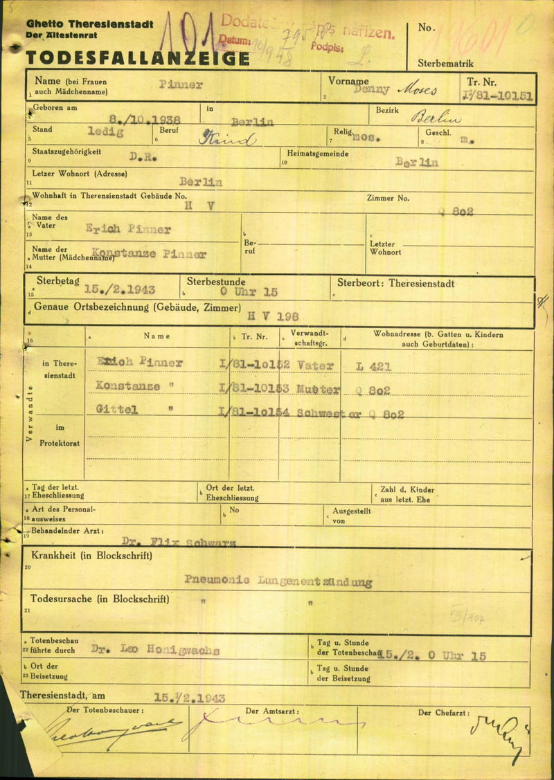 Pinner Denny: Todesfallanzeige, Ghetto Theresienstadt