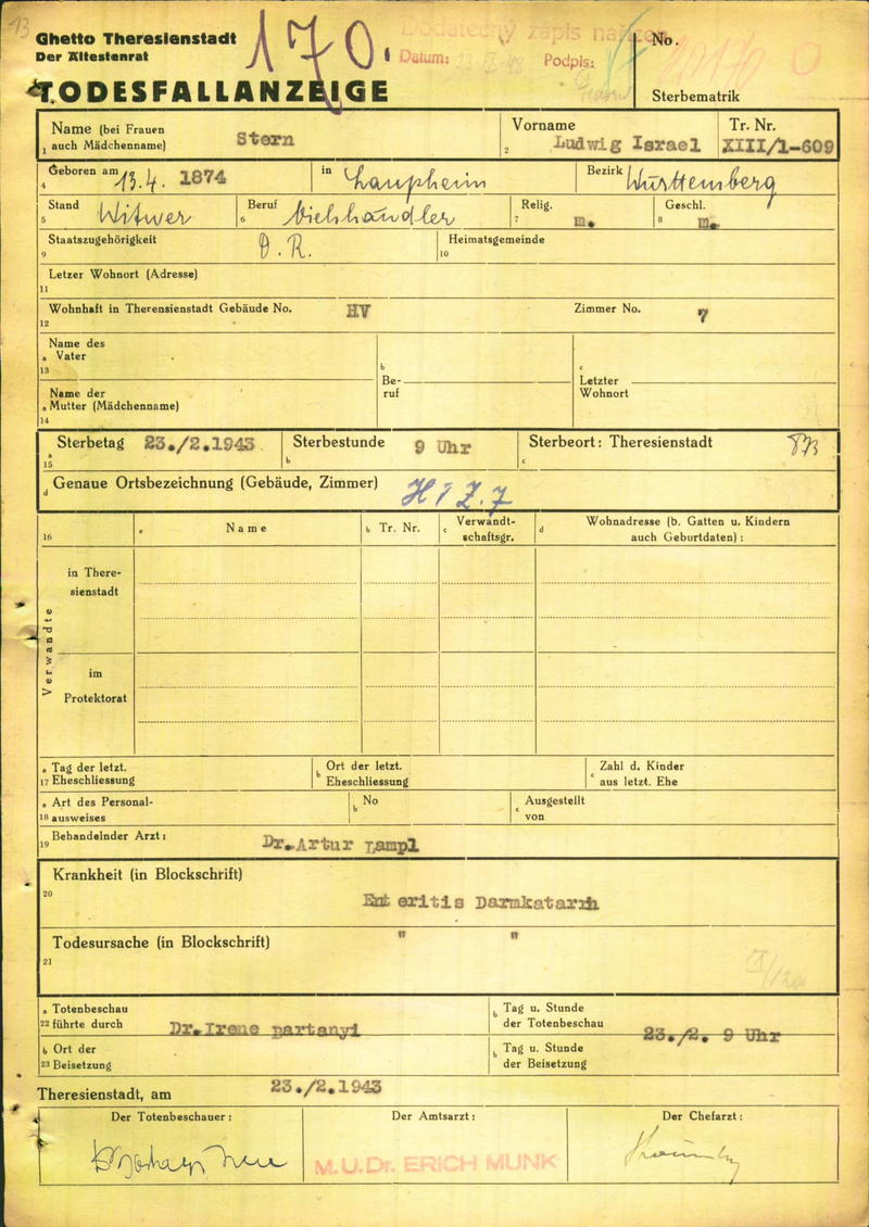 Stern Ludwig: Todesfallanzeige, Ghetto Theresienstadt