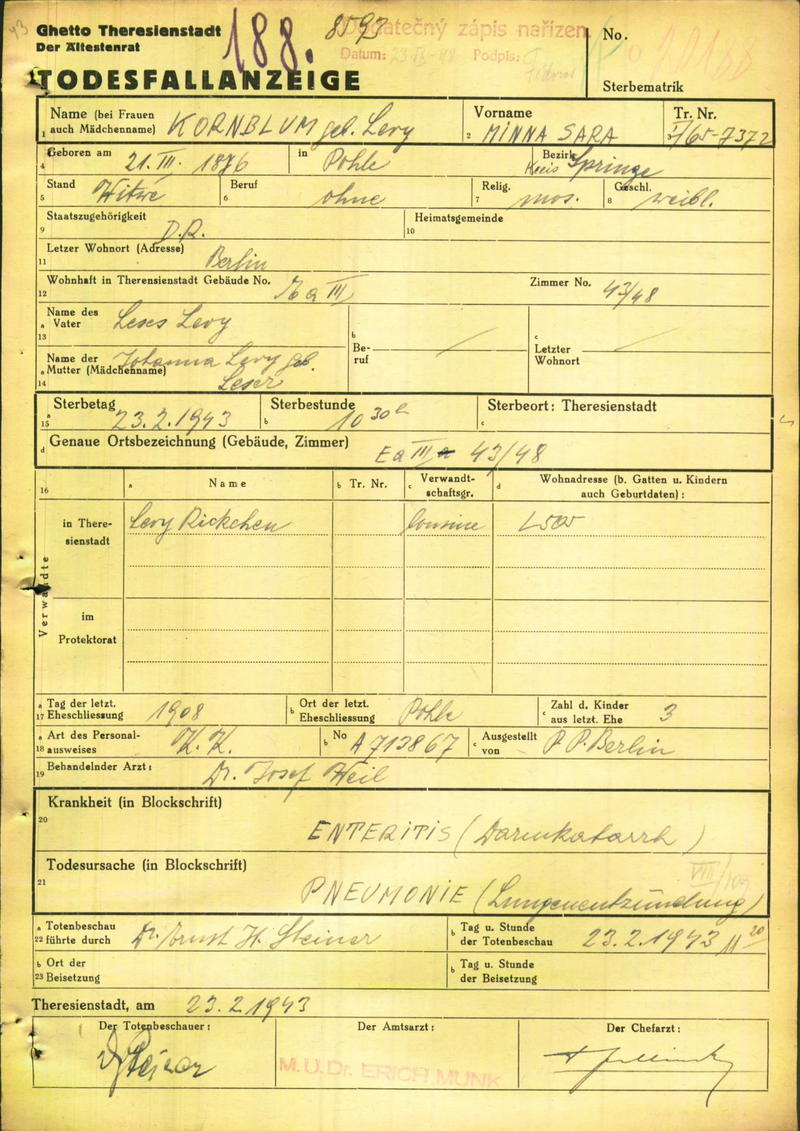 Kornblum Minna: Todesfallanzeige, Ghetto Theresienstadt