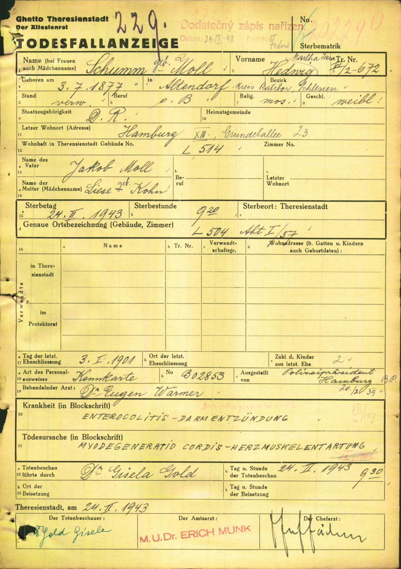 Schumm Hedwig Martha: Todesfallanzeige, Ghetto Theresienstadt