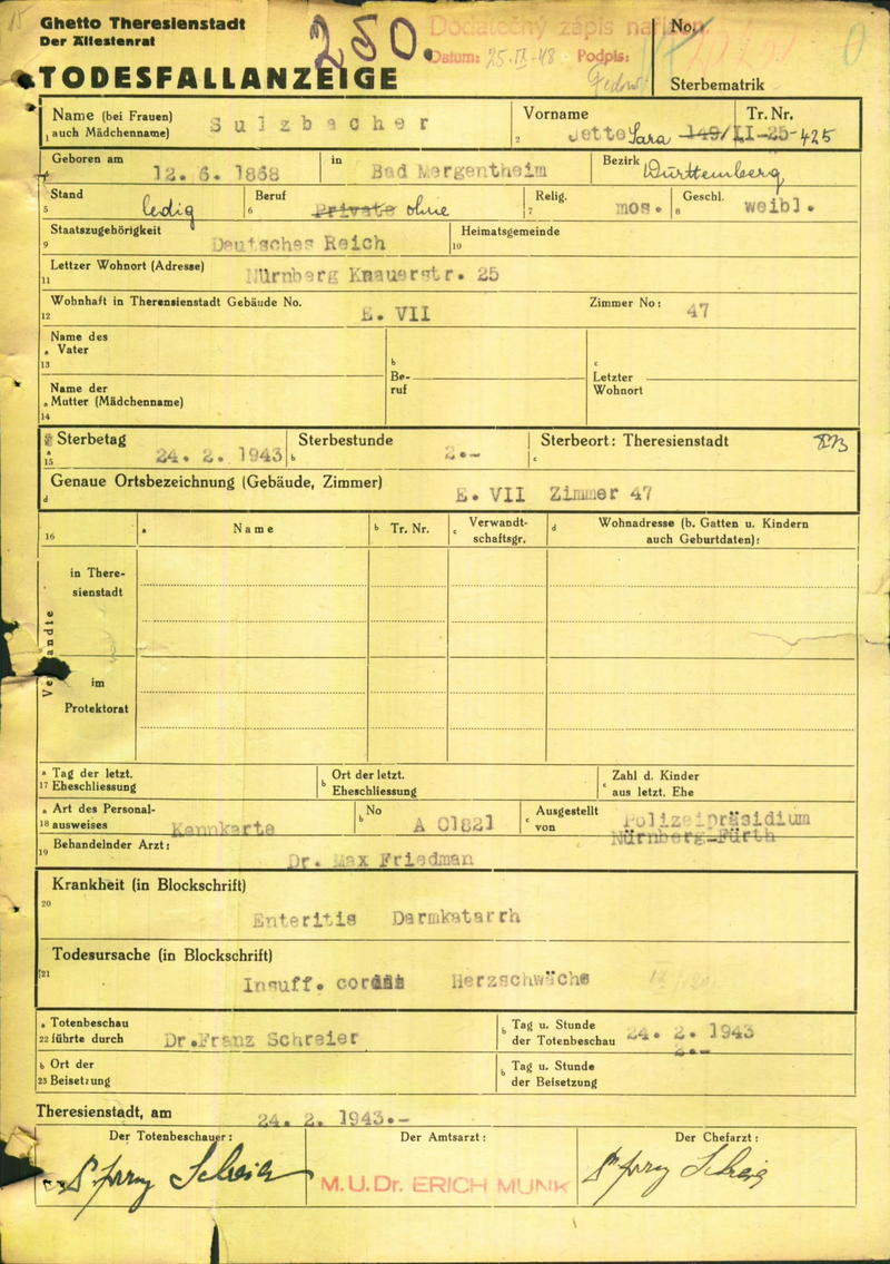 Sulzbacher Jette: Todesfallanzeige, Ghetto Theresienstadt