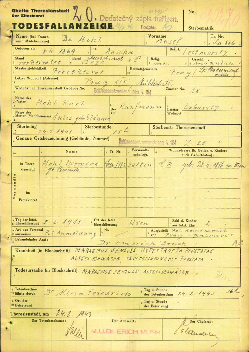 Mohl Josef: Todesfallanzeige, Ghetto Theresienstadt