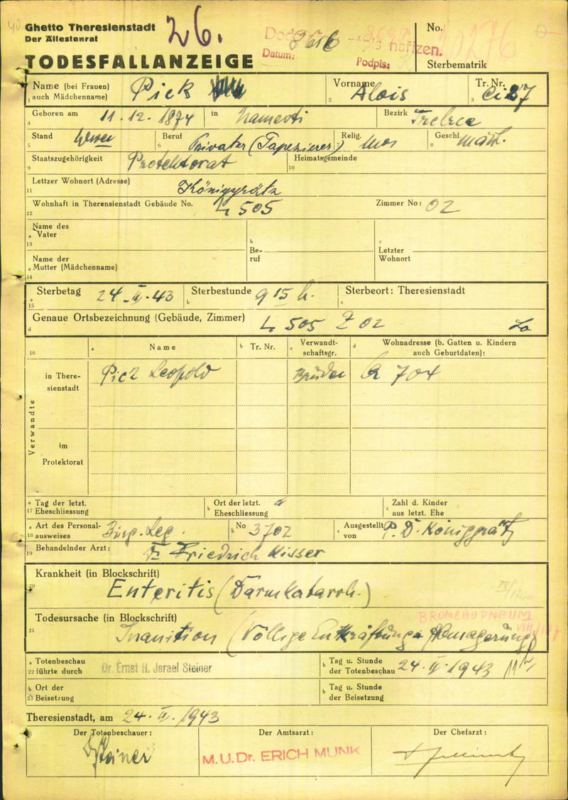 Pick Alois: Todesfallanzeige, Ghetto Theresienstadt