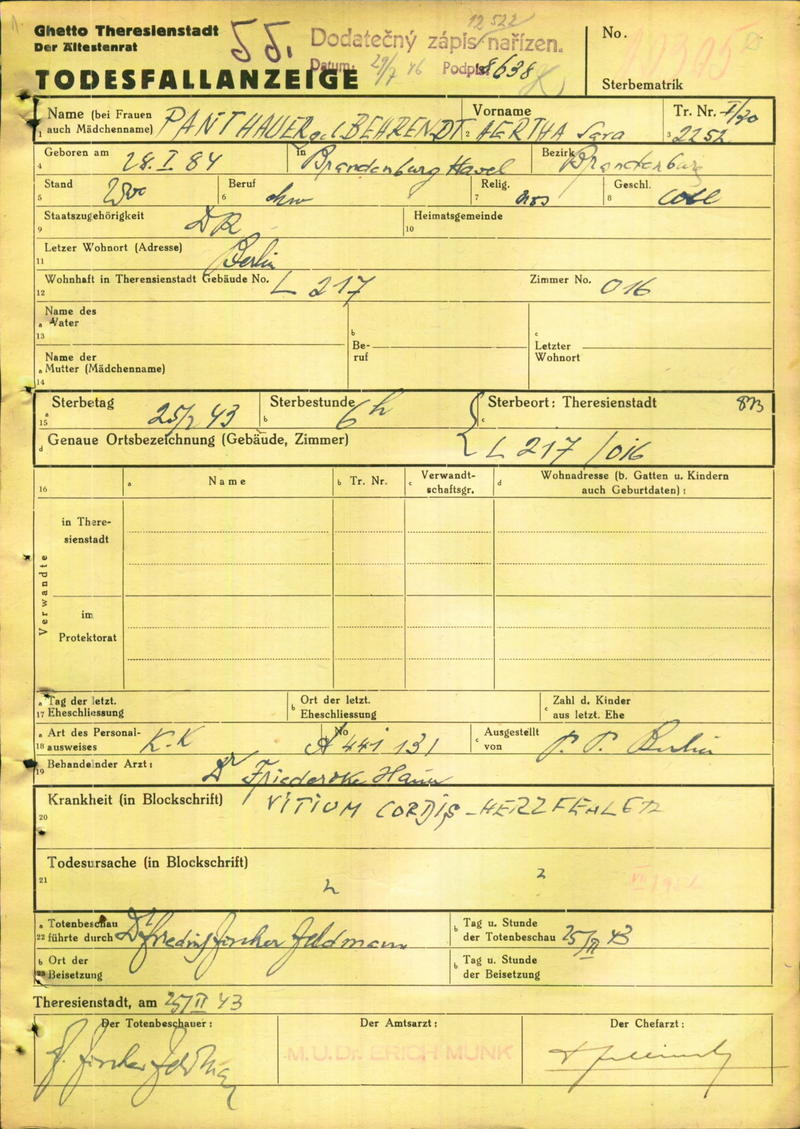 Panthauer Hertha: Todesfallanzeige, Ghetto Theresienstadt