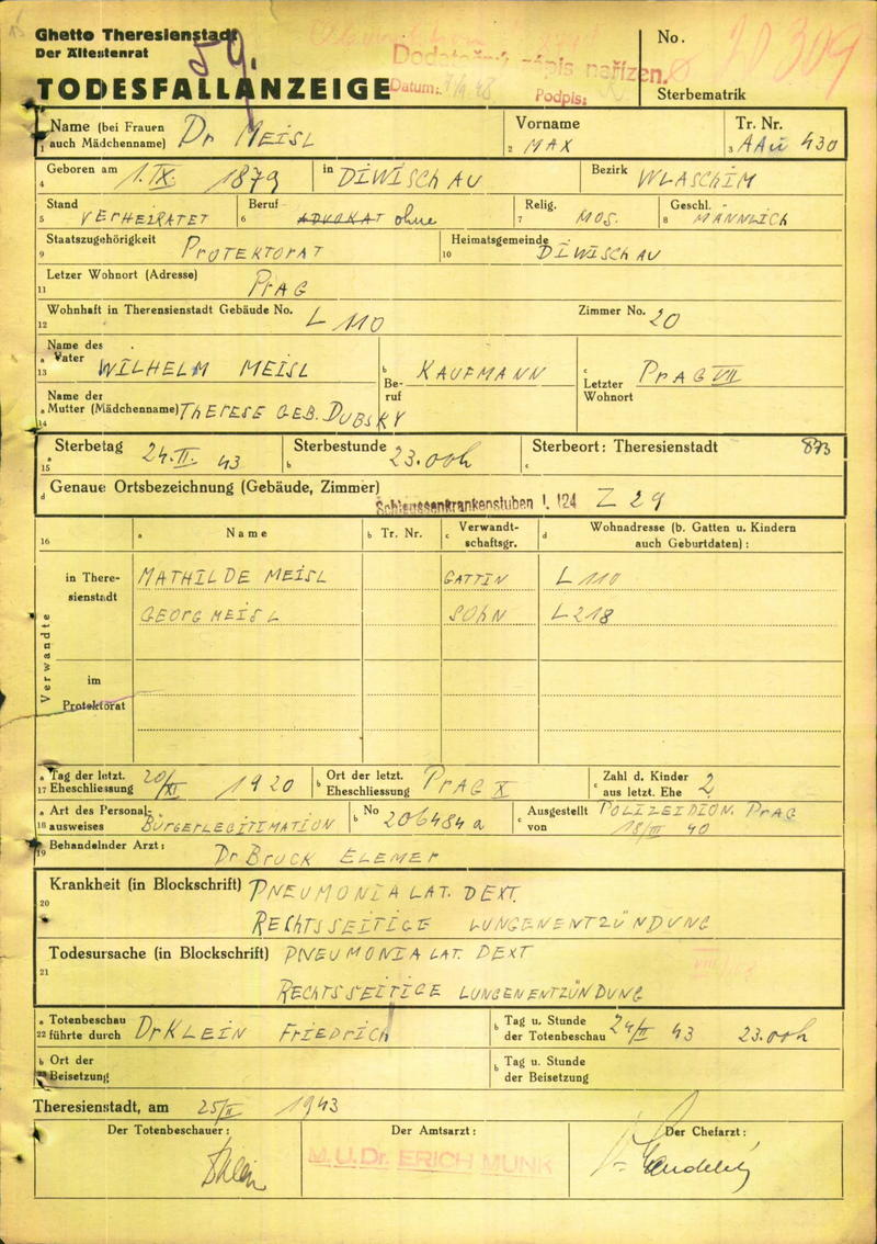 Meisl Max: Todesfallanzeige, Ghetto Theresienstadt