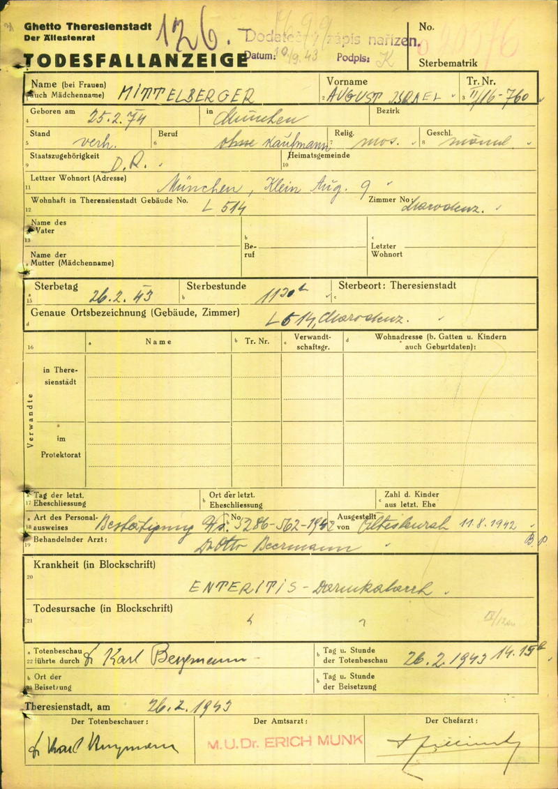 Mittelberger August: Todesfallanzeige, Ghetto Theresienstadt