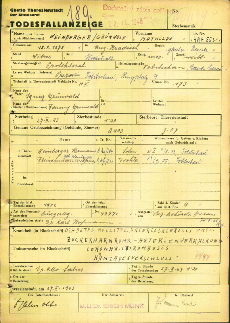 Weinbergerová Matilda: Todesfallanzeige, Ghetto Theresienstadt