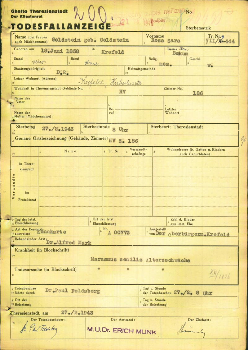 Goldstein Rosa: Todesfallanzeige, Ghetto Theresienstadt