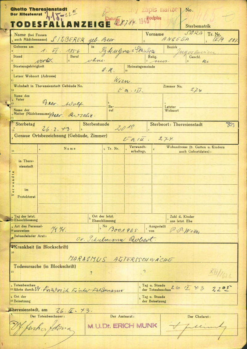 Silberer Angela: Todesfallanzeige, Ghetto Theresienstadt
