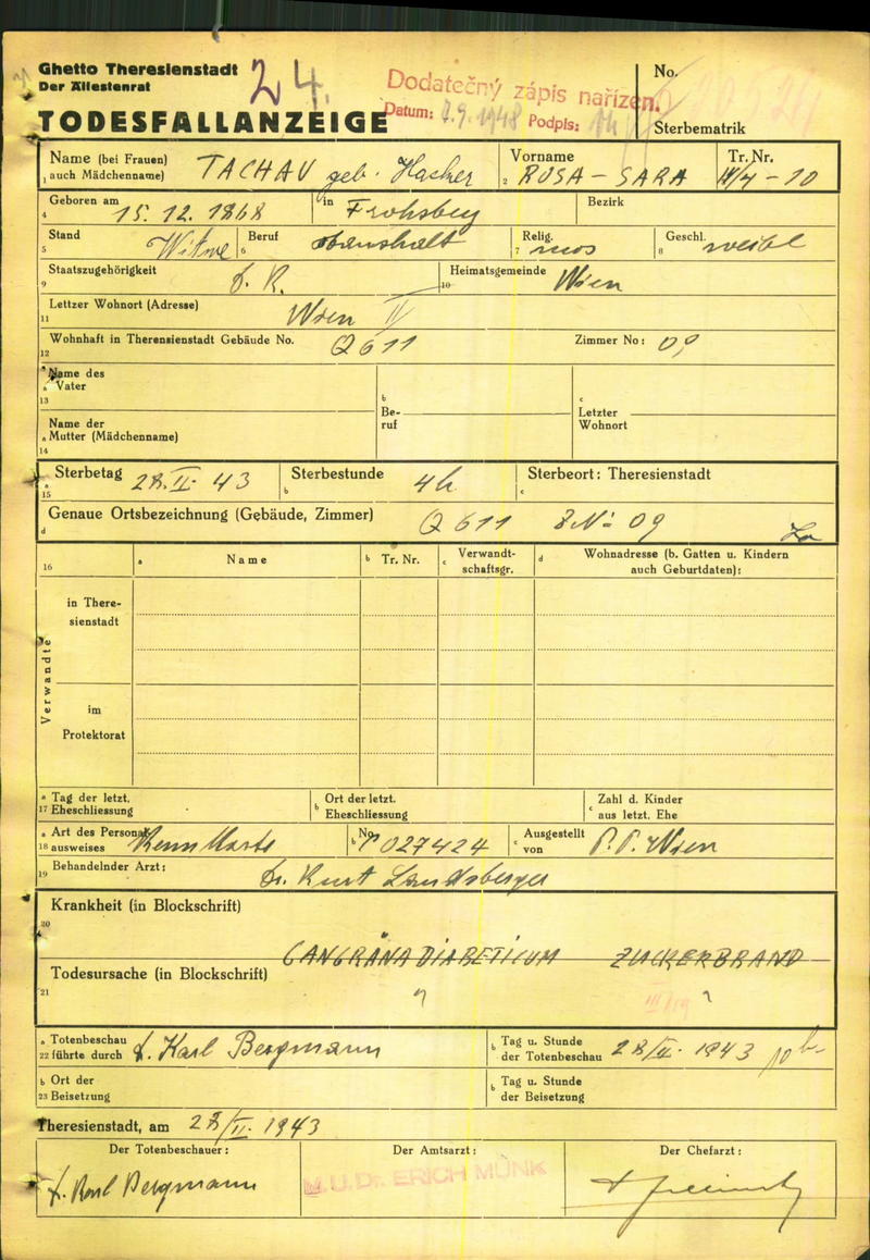 Tachau Rosa: Todesfallanzeige, Ghetto Theresienstadt