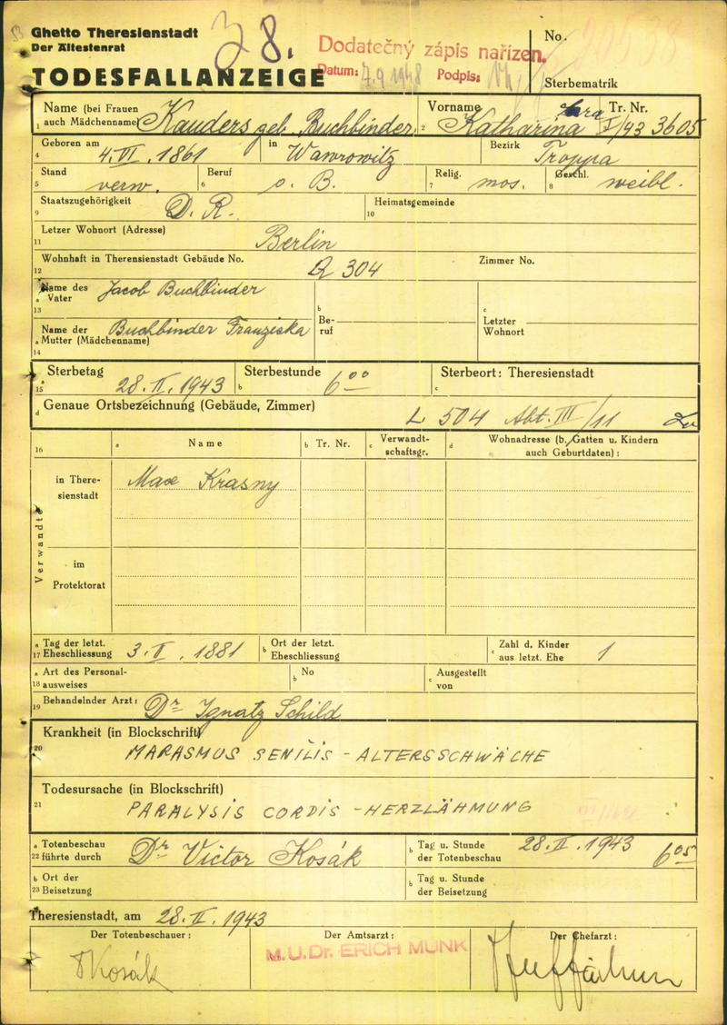 Kauders Katharine: Todesfallanzeige, Ghetto Theresienstadt