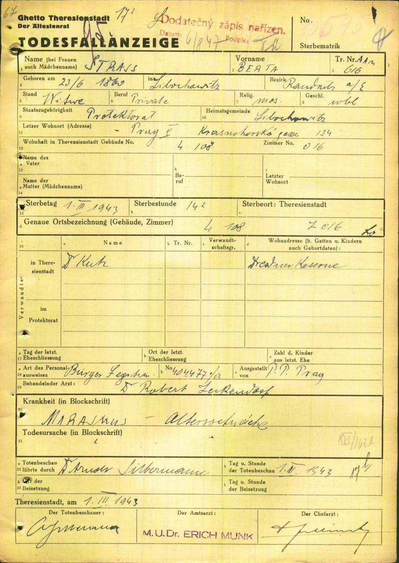 Strassová Berta: Todesfallanzeige, Ghetto Theresienstadt