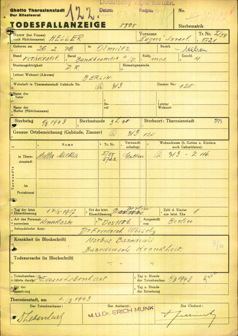 Heller Eugen: Todesfallanzeige, Ghetto Theresienstadt