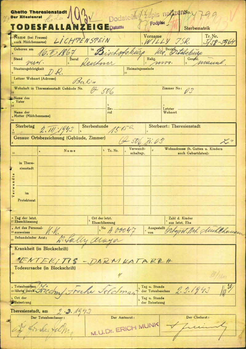 Lichtenstein Willy: Todesfallanzeige, Ghetto Theresienstadt
