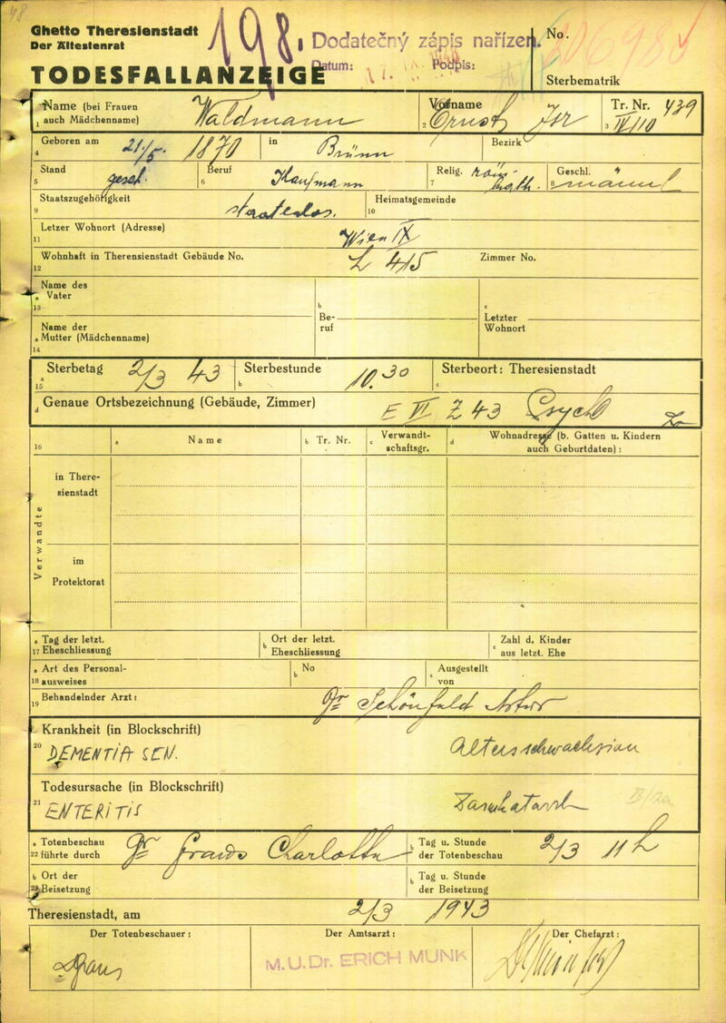 Waldmann Ernst: Todesfallanzeige, Ghetto Theresienstadt