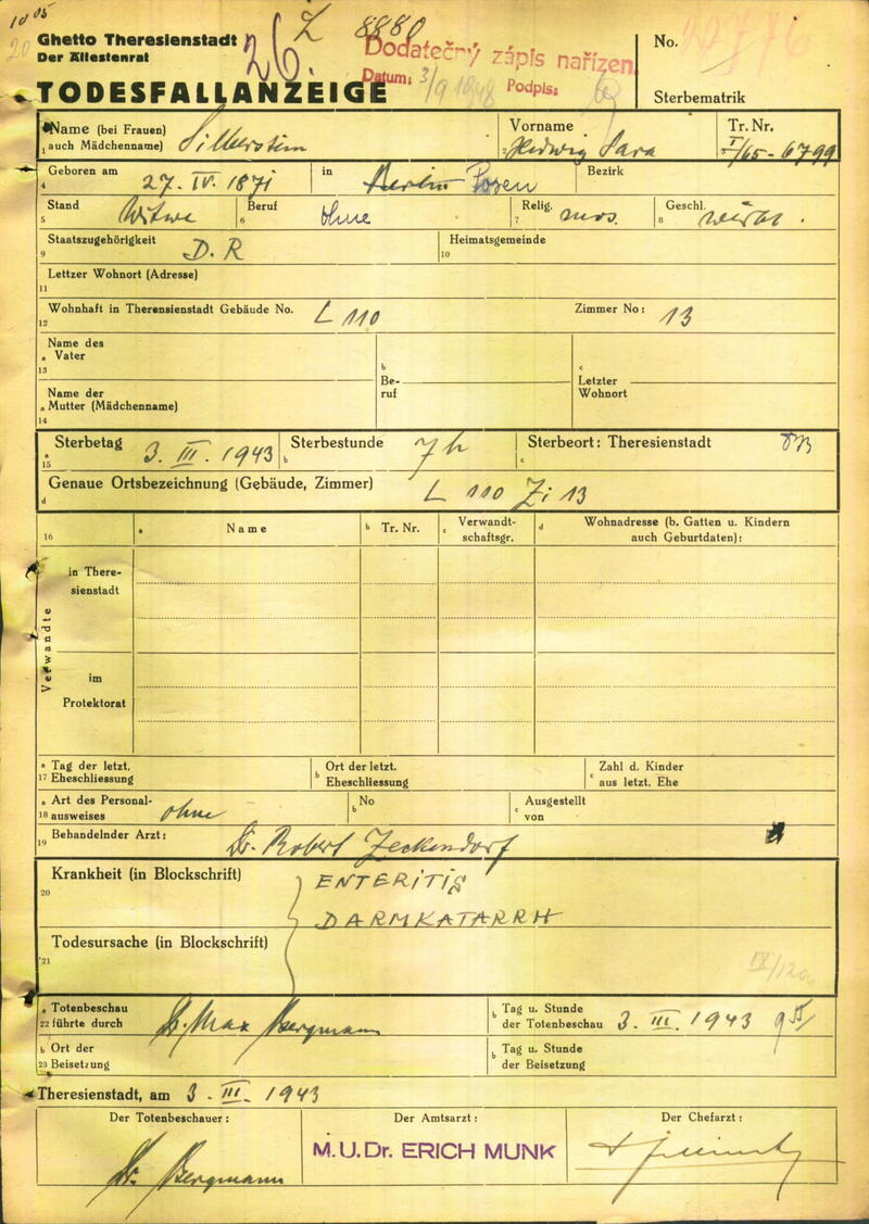 Silberstein Hedwig: Todesfallanzeige, Ghetto Theresienstadt