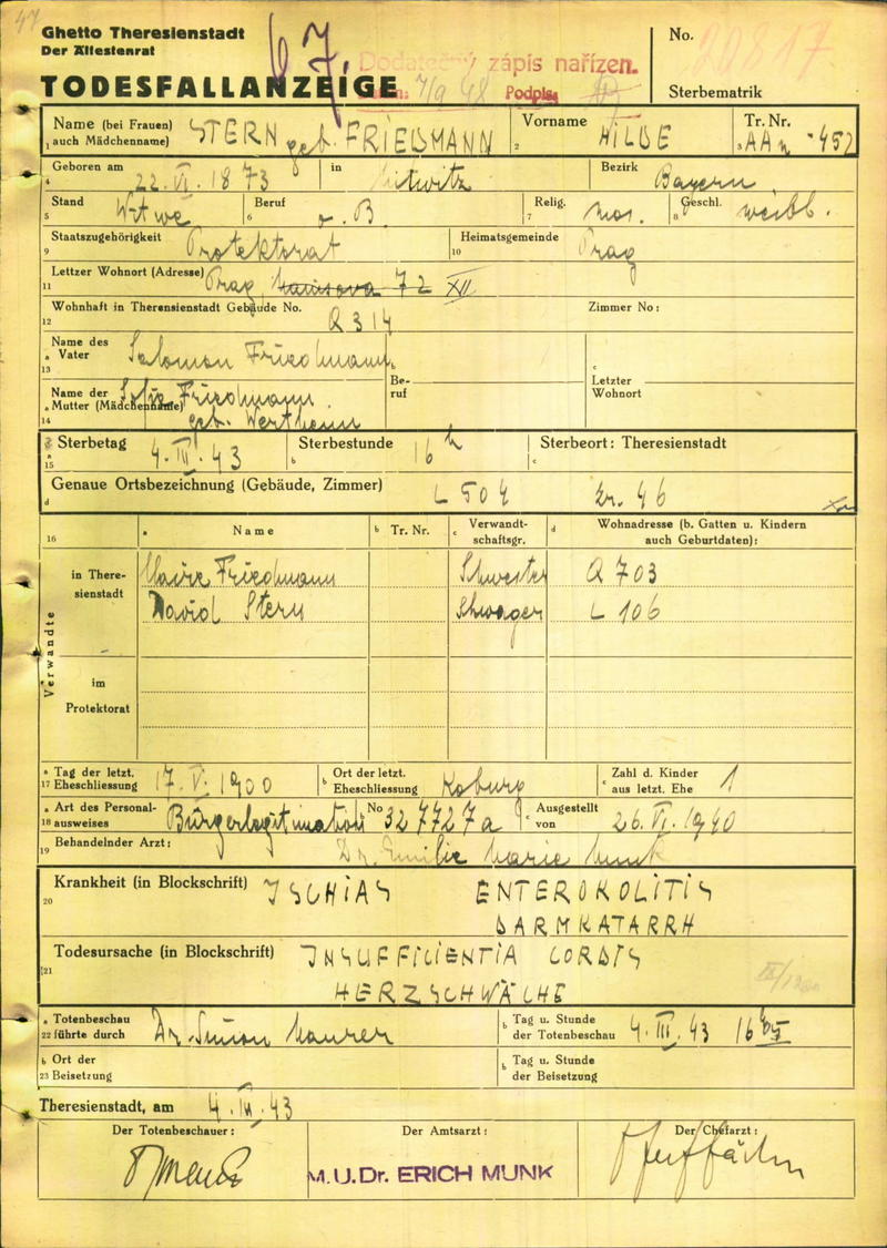 Sternová Hilda: Todesfallanzeige, Ghetto Theresienstadt