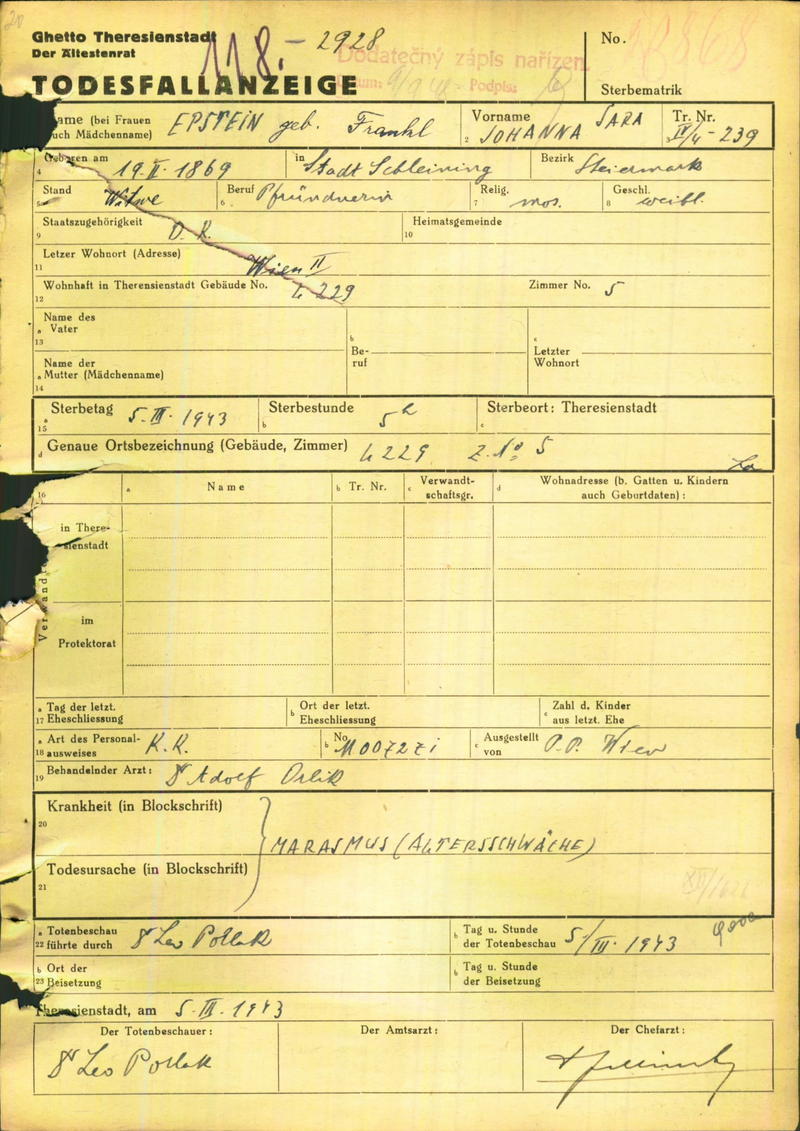 Epstein Johanna: Todesfallanzeige, Ghetto Theresienstadt