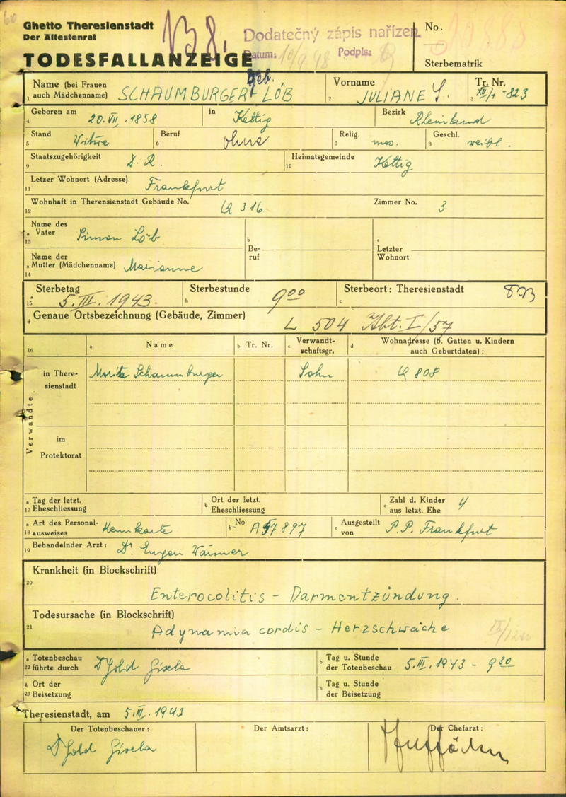 Schaumburger Juliana: Todesfallanzeige, Ghetto Theresienstadt