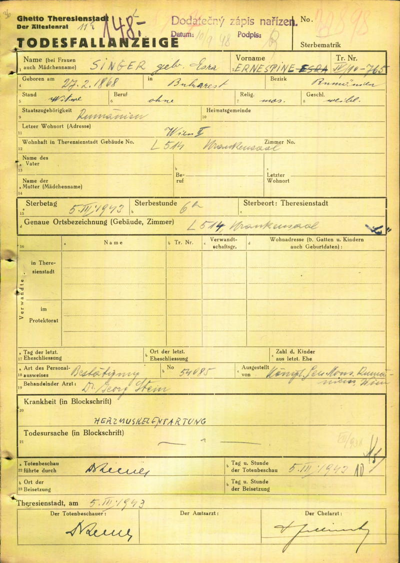 Singer Ernestine: Todesfallanzeige, Ghetto Theresienstadt