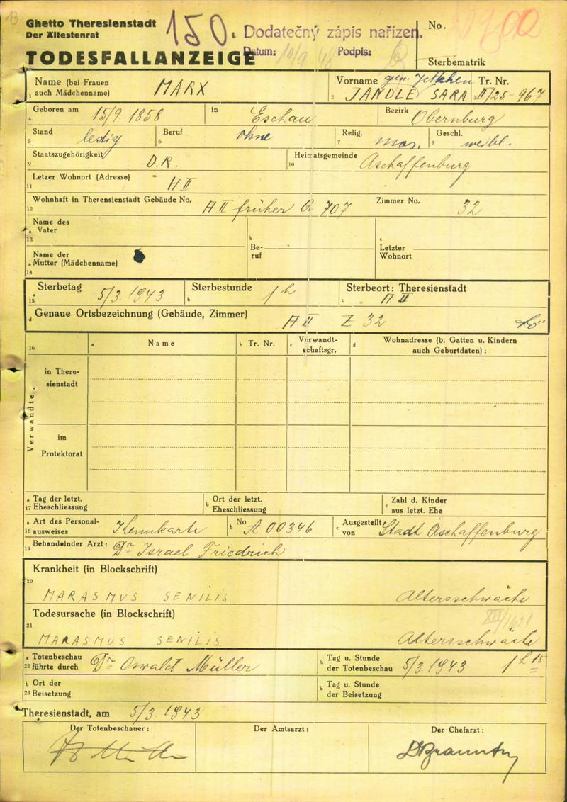Marx Jette: Todesfallanzeige, Ghetto Theresienstadt