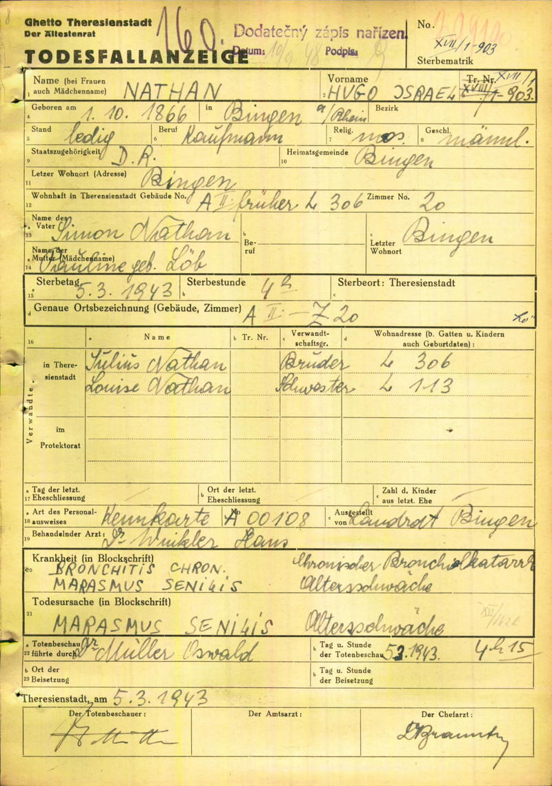 Nathan Hugo: Todesfallanzeige, Ghetto Theresienstadt