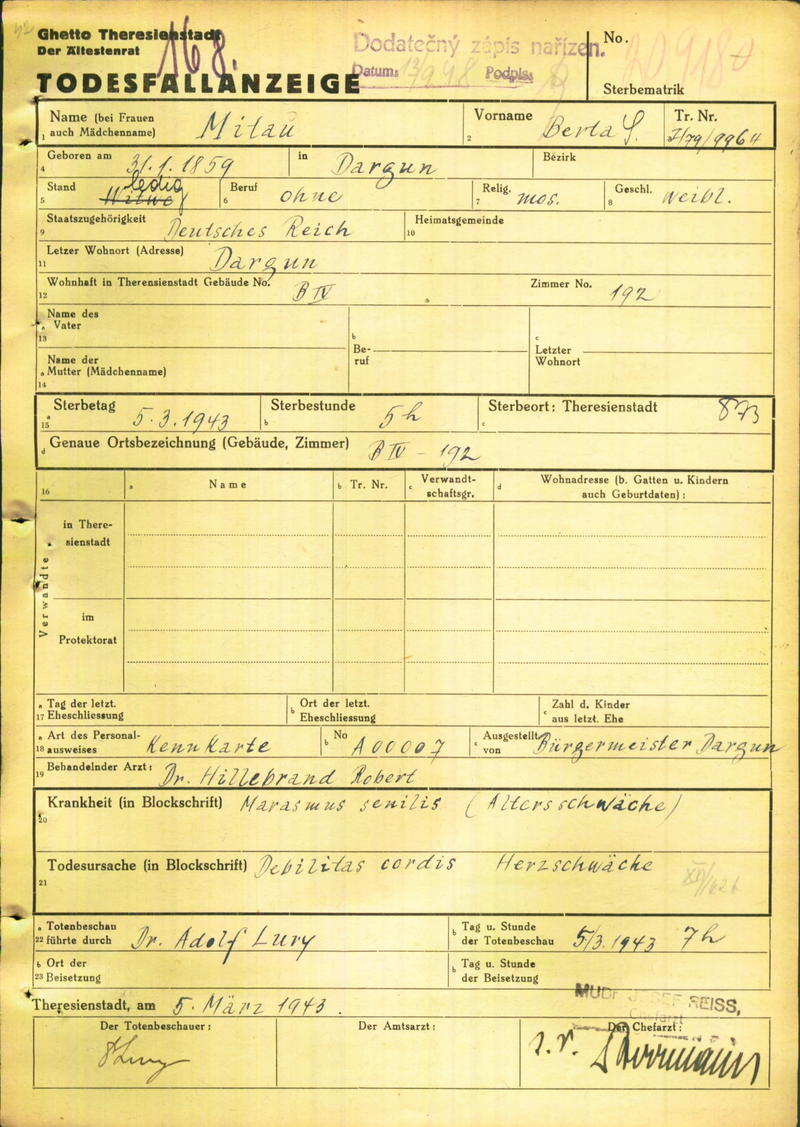 Mitau Berta: Todesfallanzeige, Ghetto Theresienstadt