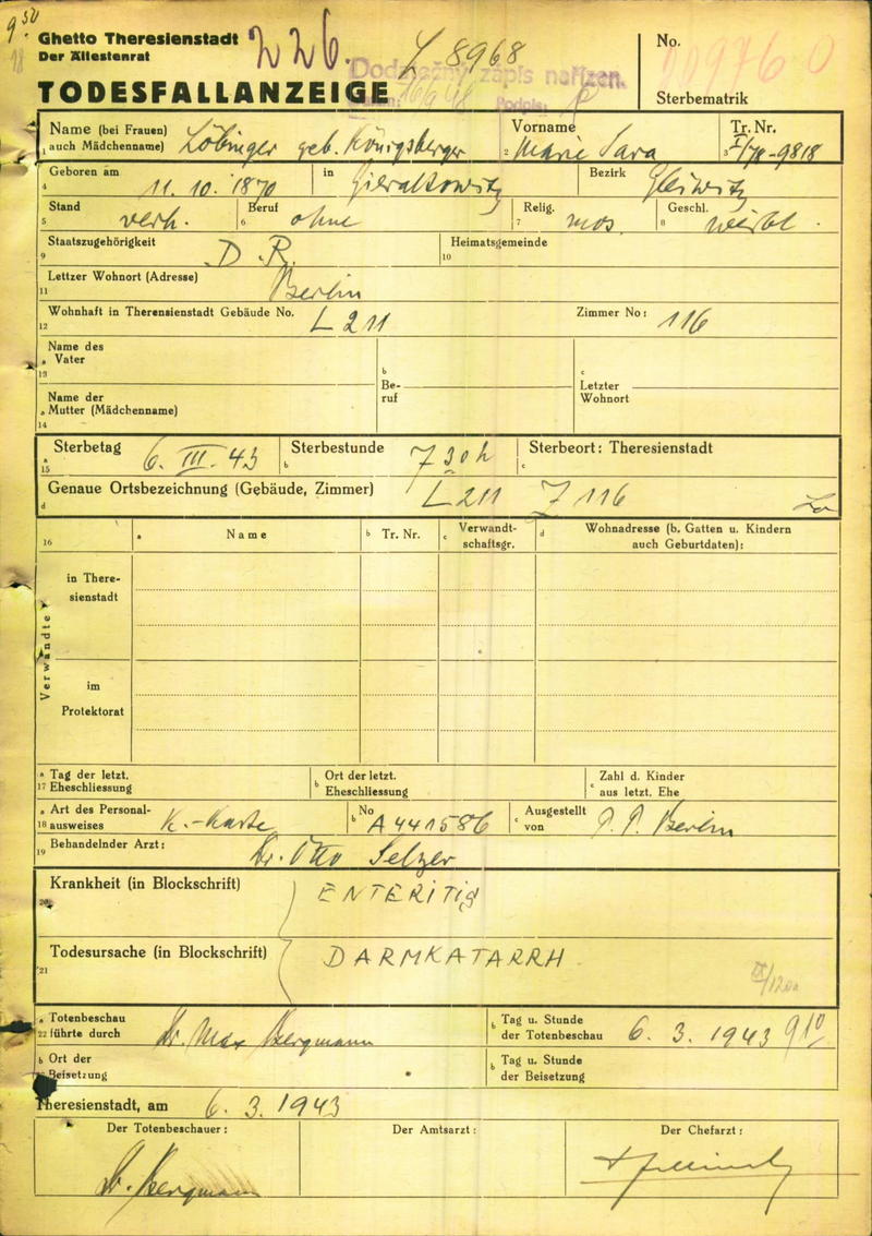 Löbinger Marie: Todesfallanzeige, Ghetto Theresienstadt