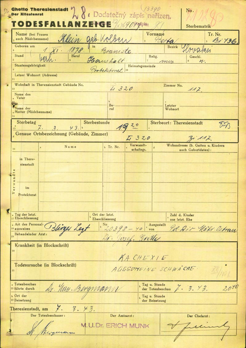 Kleinová Berta: Todesfallanzeige, Ghetto Theresienstadt