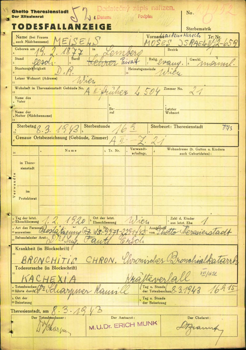 Meisels Moses Markus Hirsch: Todesfallanzeige, Ghetto Theresienstadt