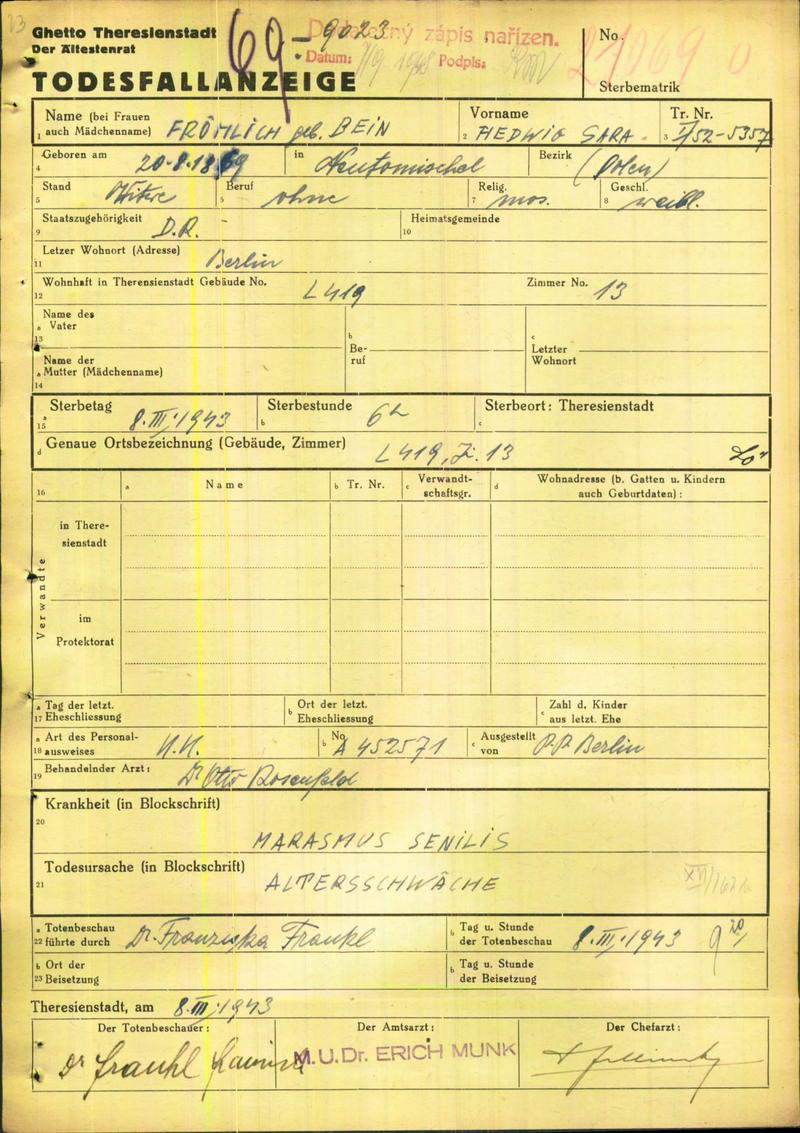 Fröhlich Hedwig: Todesfallanzeige, Ghetto Theresienstadt