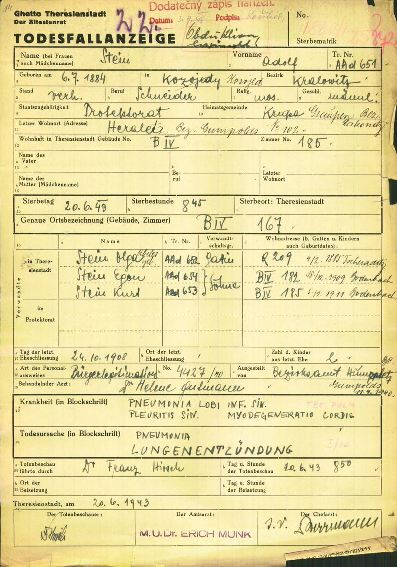 Stein Adolf: Todesfallanzeige, Ghetto Theresienstadt