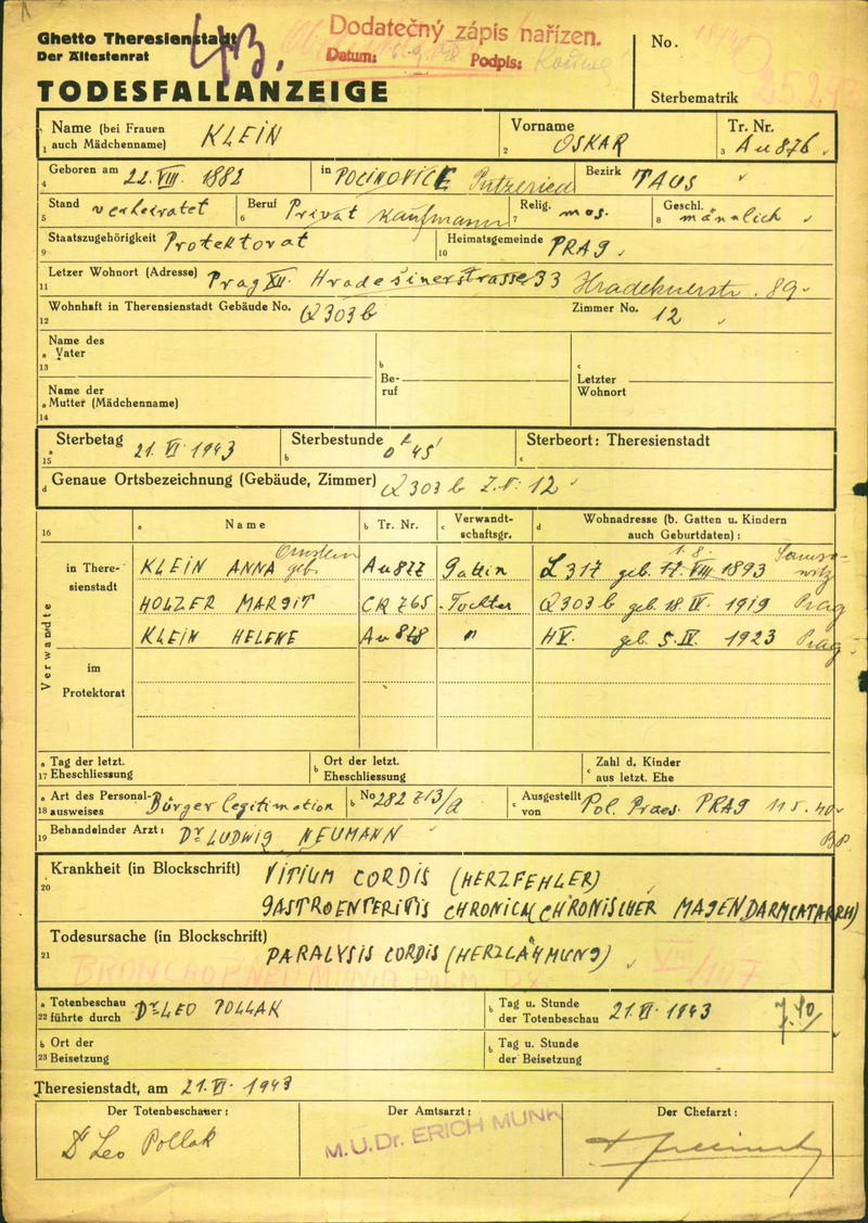 Klein Oskar: Todesfallanzeige, Ghetto Theresienstadt