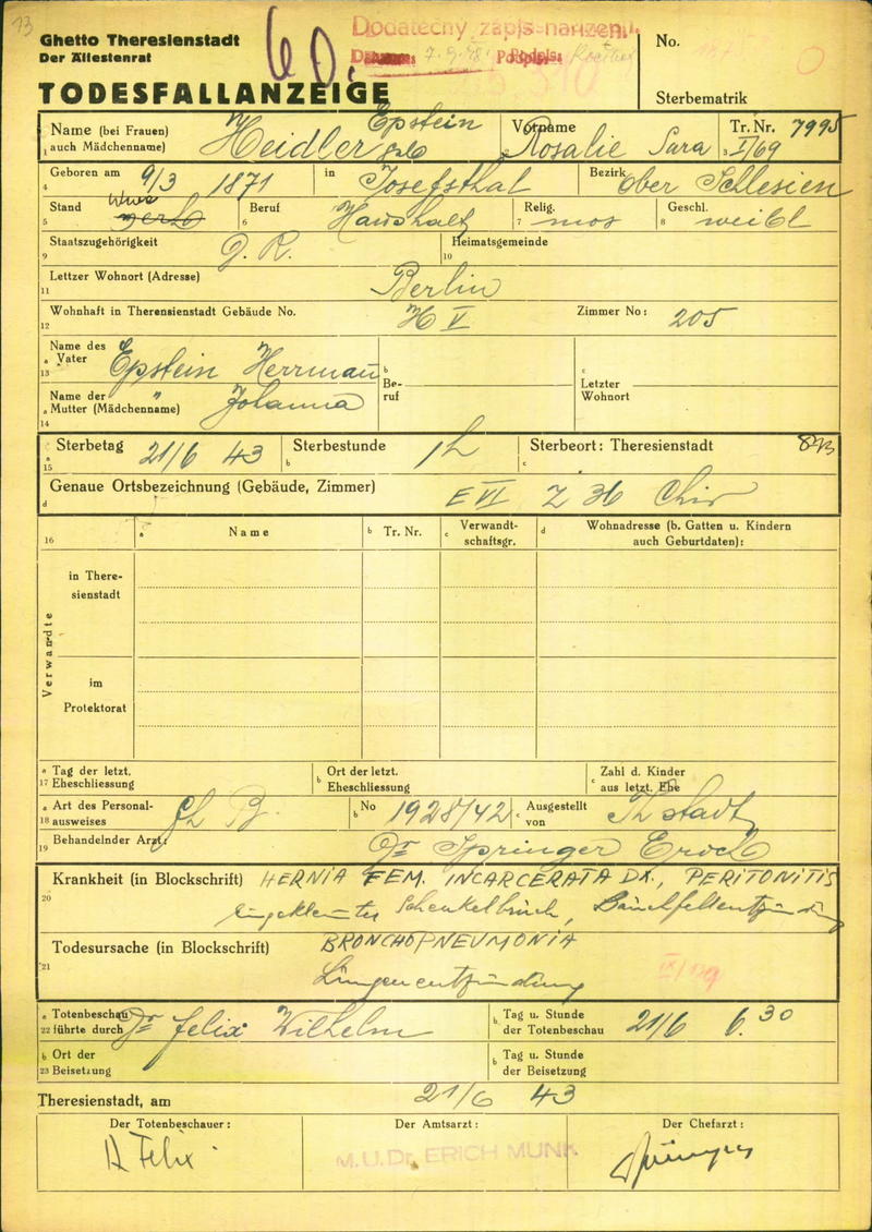 Heidler Rosalie: Todesfallanzeige, Ghetto Theresienstadt