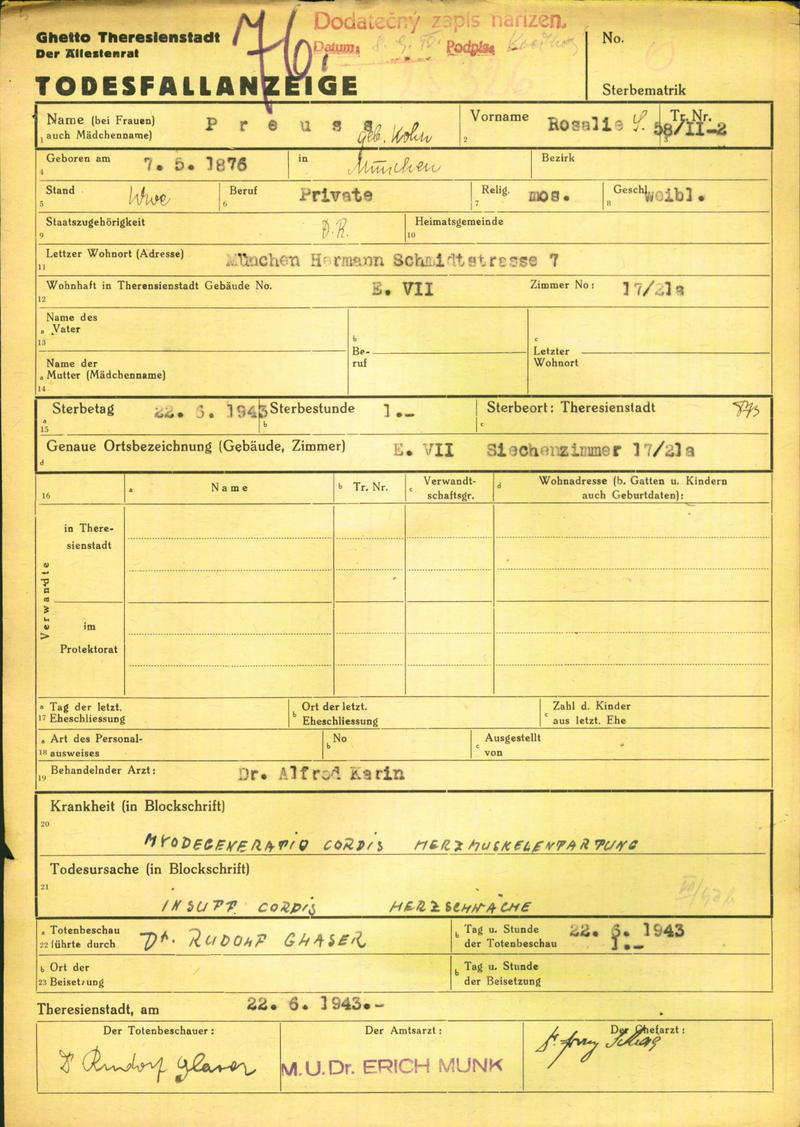 Preuss Rosalie: Todesfallanzeige, Ghetto Theresienstadt