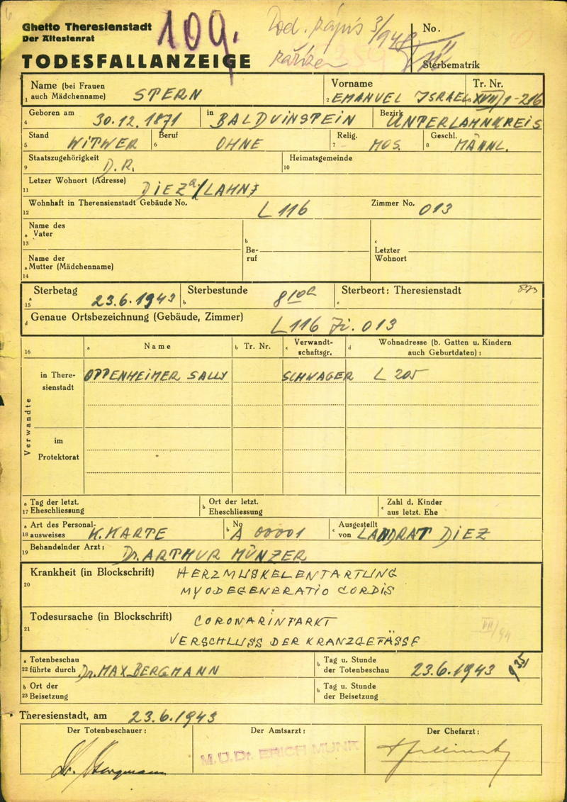 Stern Emanuel: Todesfallanzeige, Ghetto Theresienstadt