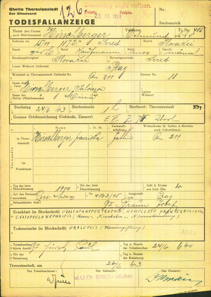 Hirschberger Edmund: Todesfallanzeige, Ghetto Theresienstadt