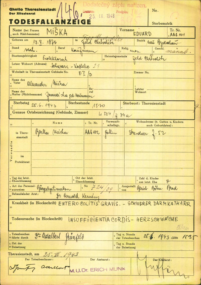 Miška Eduard: Todesfallanzeige, Ghetto Theresienstadt