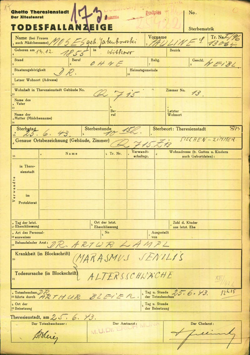 Moses Pauline: Todesfallanzeige, Ghetto Theresienstadt