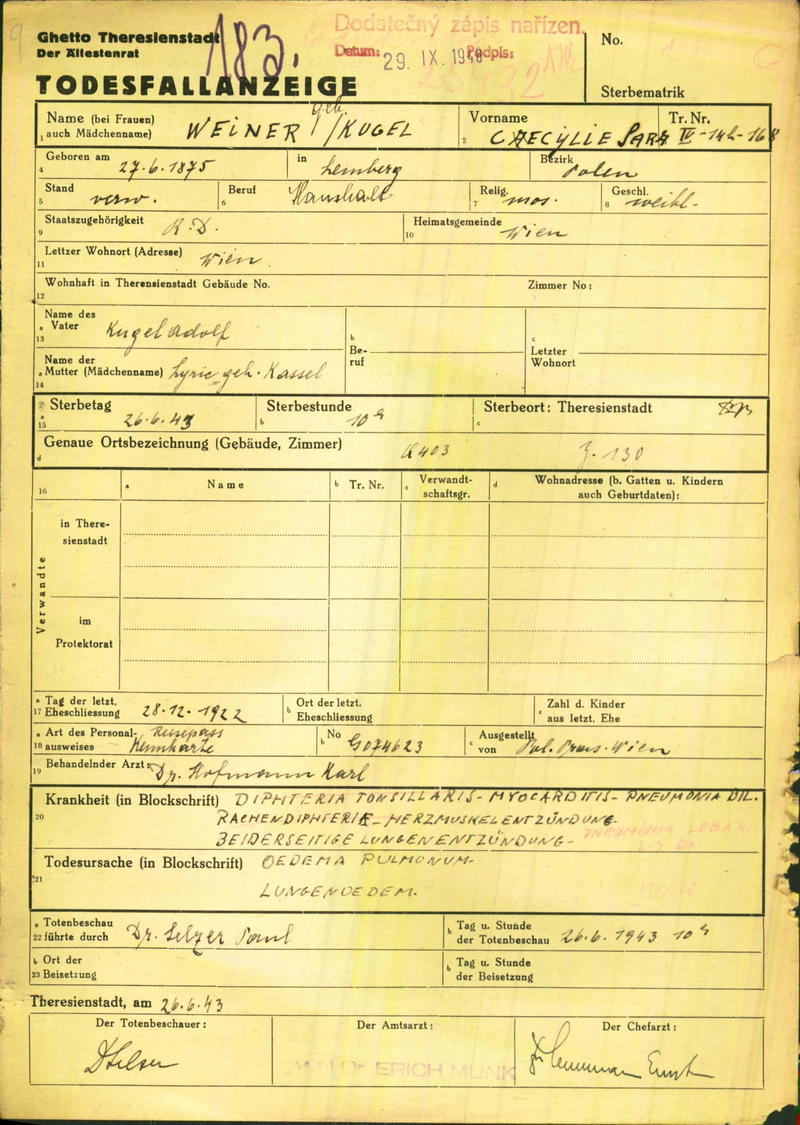 Weiner Cäcilie: Todesfallanzeige, Ghetto Theresienstadt