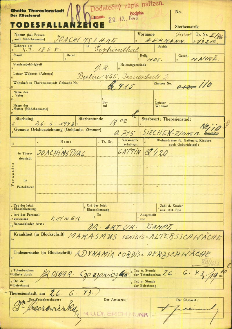 Joachimsthal Hermann: Todesfallanzeige, Ghetto Theresienstadt
